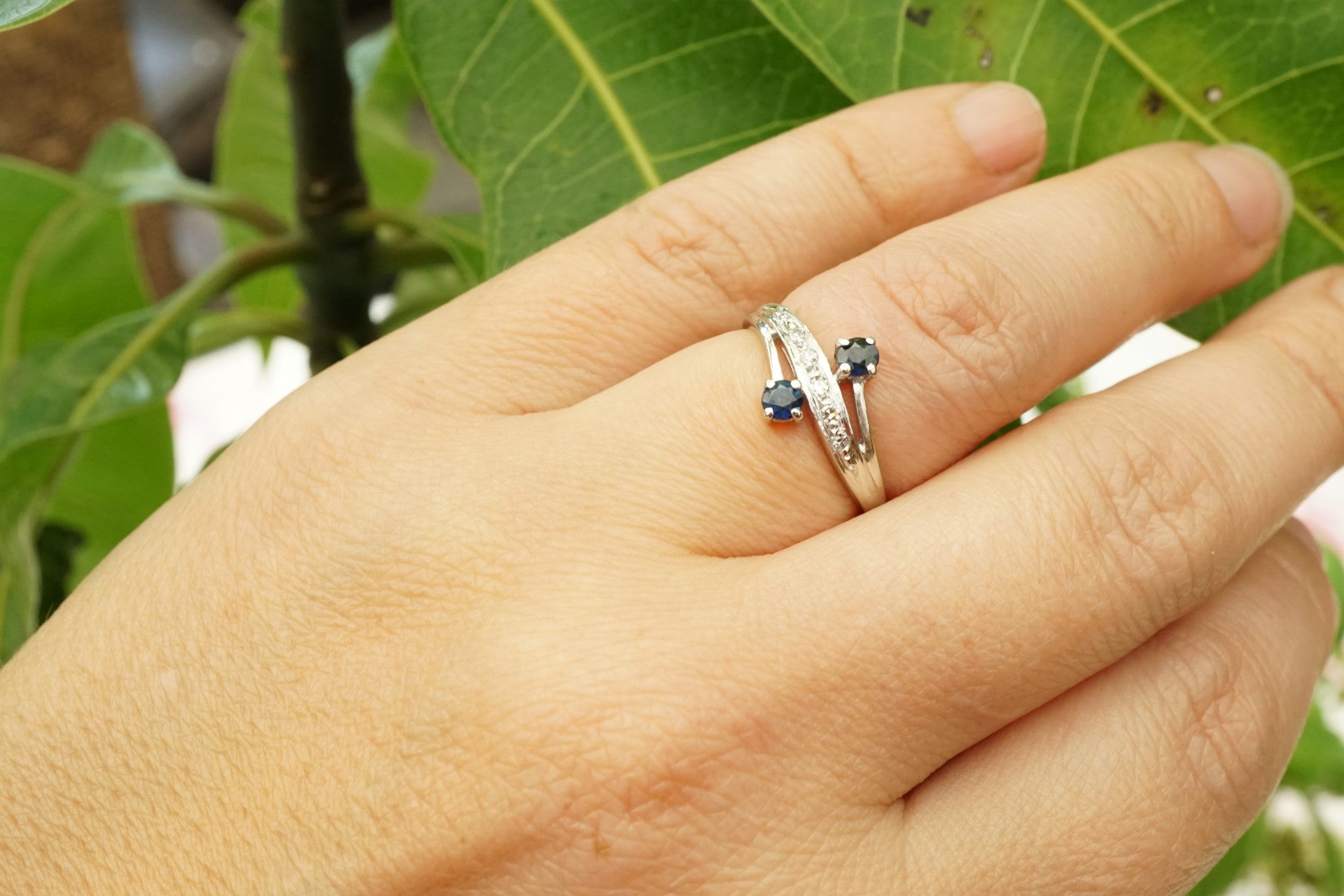 Mooie ring in 18 karaat witgoud (gestempeld) bezet met 5 diamanten +/-0.08 karaat en 2 blauwe saffieren.Maat 52, gewicht 2,4 gr.